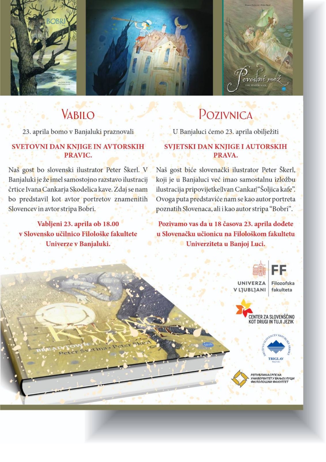 Данас у 18 часова обиљежићемо Свјетски дан књиге и ауторских права у Словеначкој учионици. Наш гост биће словеначки илустратор Петер Шкерл.